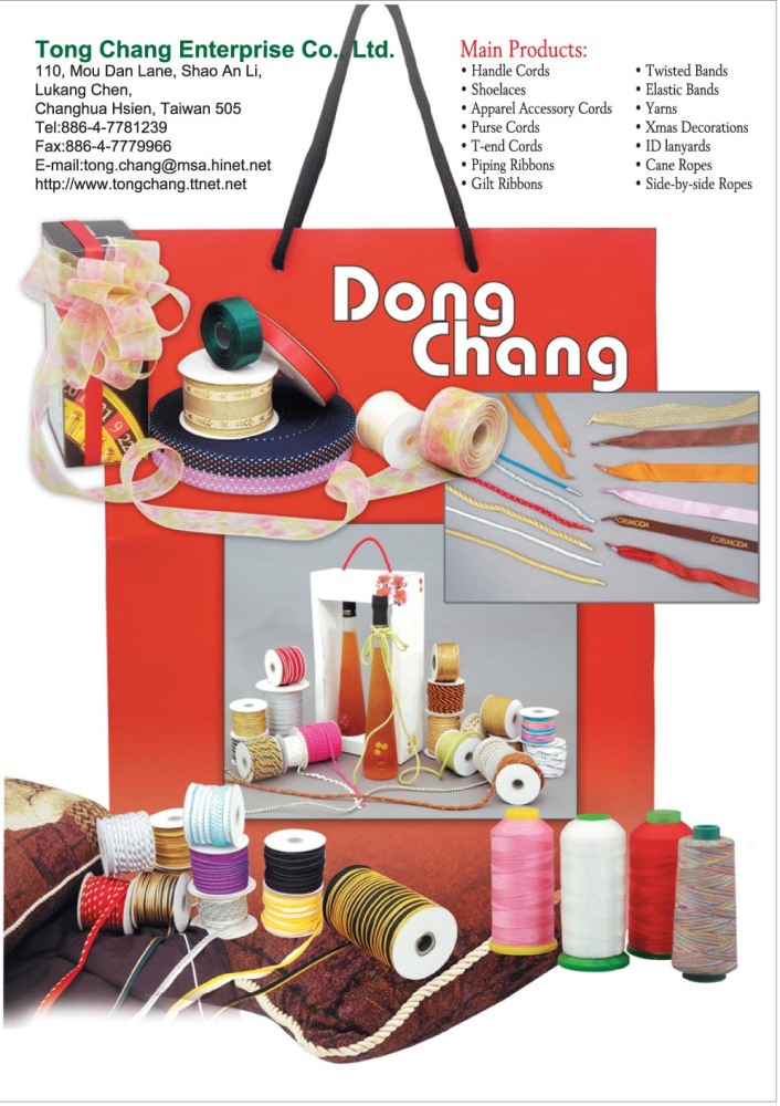 主要產品:手提繩、鞋帶、成衣配件繩、皮包用繩、三股繩、滾邊帶、金蔥帶、母子、鬆緊帶、車線、聖誕飾品、識別証帶、柺杖繩、排併繩